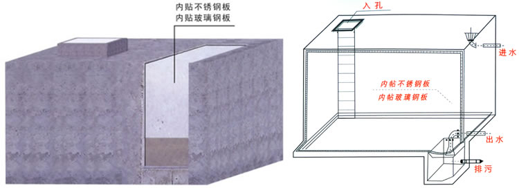 內(nèi)襯不銹鋼、玻璃鋼水池工藝優(yōu)勢: 混凝土水池由于內(nèi)表面粗糙,極易滋生青苔和微生物,污染水質(zhì),清洗比較困難。隨著人民生活水平不斷提高,用水量及水質(zhì)標(biāo)準(zhǔn)隨之提高,原有混凝土水池或新建混凝土水池,由于水質(zhì)不能達(dá)到用水標(biāo)準(zhǔn),故目前廣泛采用食品級不銹鋼(SUS304)或食品級玻璃鋼襯貼混凝土水池內(nèi)表面,不僅防止二次污染,清洗方便,而且具有耐腐蝕,內(nèi)表面清潔平整等優(yōu)點。 大容積水池采用食品級不銹鋼板(SUS304)或食品級玻璃鋼襯貼混凝土水池內(nèi)貼壁方法,價格低廉,經(jīng)濟實惠,是目前提高水質(zhì)標(biāo)準(zhǔn)而被廣泛推廣的新措施。 |